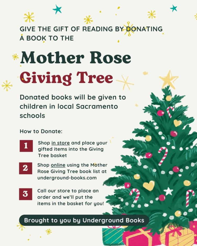 The Mother Rose Giving Tree is a community-driven holiday initiative at Underground Books that invites customers to give the gift of reading. Shoppers can support the program by purchasing books and gift items in-store, online from the Mother Rose Giving Tree book list, or by calling the store to place an order. All donated items are placed in the Giving Tree basket and shared with those in need, continuing Mother Rose’s legacy of literacy, love, and community care.