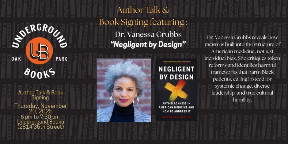 Join us at Underground Books for an inspiring evening with Dr. Vanessa Grubbs—physician, activist, and author—as she signs copies of her powerful new book exposing the roots of racism in American medicine and calling for true systemic change.
